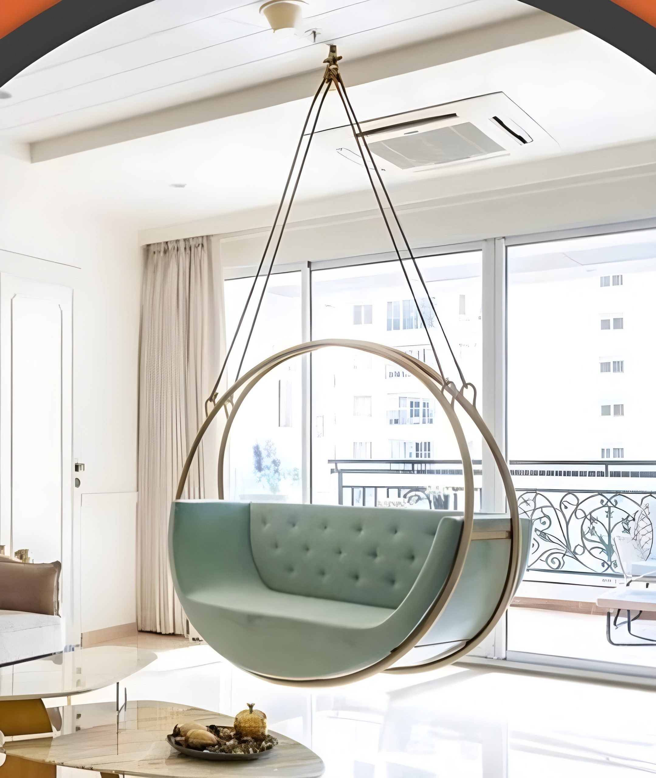 The image displays a modern, two-seater hanging sofa, often referred to as a “Bubble Sofa Lounge Chair” or a type of luxury swing. The chair features a large, circular gold-tone metal frame with light mint-green, tufted cushions for seating and back support. It is suspended from the ceiling by thick ropes.