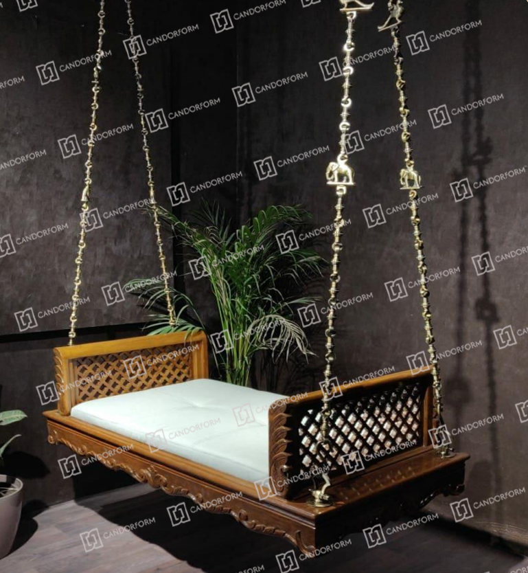 The generously cushioned seat provides exceptional comfort, making it ideal for relaxing, reading, or spending quality time with family. Soft, supportive cushions are upholstered in premium fabric, available in multiple colors to suit your personal style. Strong hanging chains or ropes ensure safe suspension and stability while gently swaying. Suitable for living rooms, balconies, verandas, or garden areas, this wooden hanging swing sofa creates a cozy, luxurious seating experience while adding a timeless charm to your space.