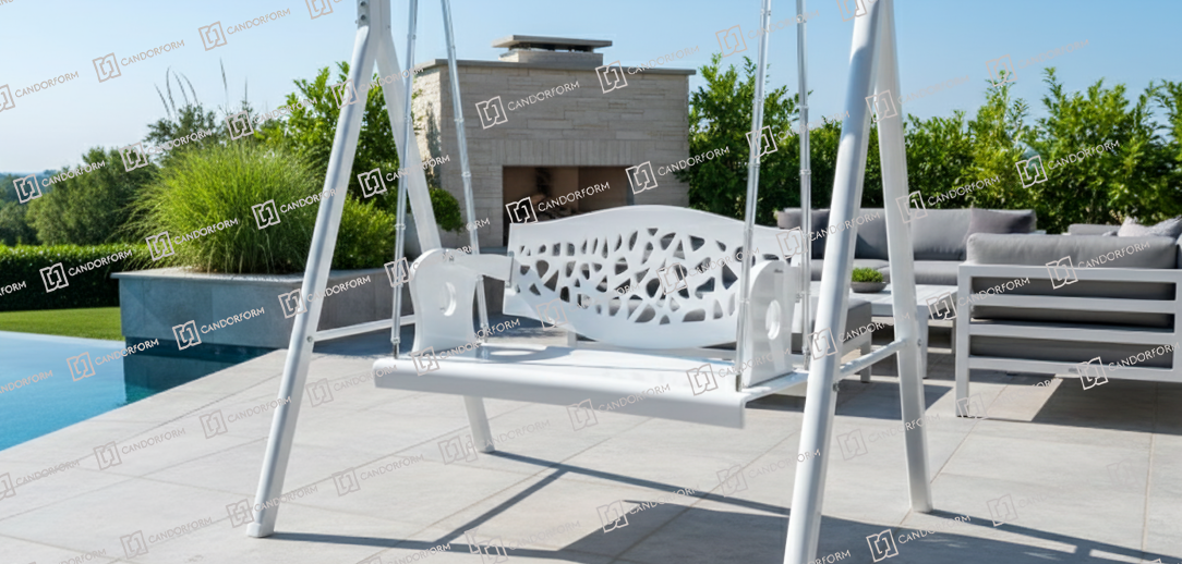 Modern White Frame Outdoor Swing Sofa with Decorative Backrest is a perfect combination of contemporary design, comfort, and durability, making it an elegant addition to gardens, terraces, patios, or open balconies. Crafted with a strong white-coated frame, this swing sofa offers excellent stability while maintaining a clean, minimalist appearance that blends beautifully with outdoor surroundings. The wooden seating platform is smooth and well-finished, providing long-lasting support and a natural contrast to the crisp white structure. Its standout feature is the decorative backrest, designed with artistic cut patterns that enhance visual appeal while allowing airflow and light to pass through, creating a refreshing outdoor seating experience. Suspended securely for gentle swinging motion, the sofa ensures relaxation and balance for daily use. Spacious seating allows comfortable lounging, while cushions can be added for enhanced comfort. Weather-resistant materials and premium finishing make this swing sofa suitable for outdoor conditions, ensuring durability and easy maintenance. Ideal for modern homes, resorts, or cafés, this outdoor swing sofa adds charm, functionality, and a luxurious feel to any open space, creating a calm and inviting environment for relaxation and leisure.