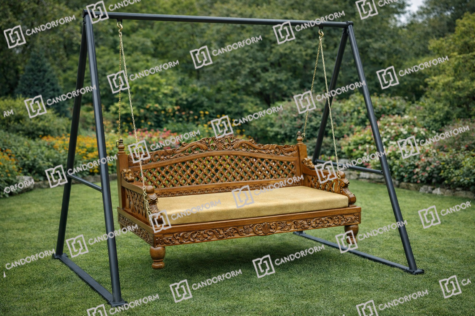 The Ornately Carved Wooden Hanging Swing Sofa is a magnificent blend of traditional artistry and luxurious comfort, designed to become a statement piece in any interior or covered outdoor space. Crafted from high-quality solid wood, the swing features elaborate hand-carved floral and scroll motifs along the backrest, armrests, and base, reflecting timeless craftsmanship and cultural elegance. The finely detailed lattice-style back adds depth and visual appeal while maintaining structural strength. Smooth contours and a rich polished finish enhance the natural beauty of the wood, giving the swing a regal and sophisticated presence. Suspended with sturdy metal chains, it offers a gentle, relaxing motion while ensuring safety and stability. The generously cushioned seat provides comfortable support, making it ideal for lounging, reading, or entertaining guests. Perfect for living rooms, verandas, balconies, or luxury lounges, this hanging swing sofa combines durability, comfort, and ornate design, creating a serene and elegant seating experience that elevates the ambiance of any space.
