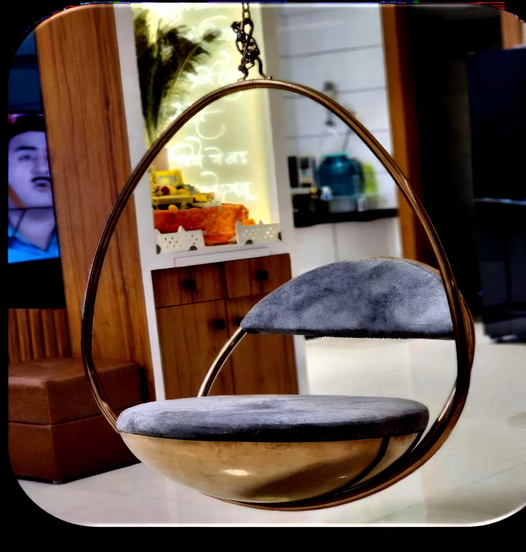 The image displays a modern, gold-finished hanging chair with a unique oval or egg shape, featuring grey fabric cushions for the seat and backrest. The chair is suspended indoors in what appears to be a contemporary living space.