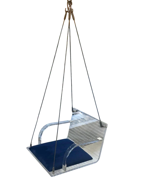 The single-seater chair is made of clear, rigid acrylic (also known as lucite), giving it a sleek and airy appearance. The seat and backrest have a slightly geometric, angled design with rounded armrests, which can sometimes be a reversible feature allowing for different seating angles. A thick, dark blue cushion is placed on the seat and acts as a backrest, providing comfort and a splash of contrasting color. The transparent design allows the chair to blend seamlessly into various decors, creating an illusion of floating. It is often used as an accent piece in living rooms, bedrooms, or balconies.