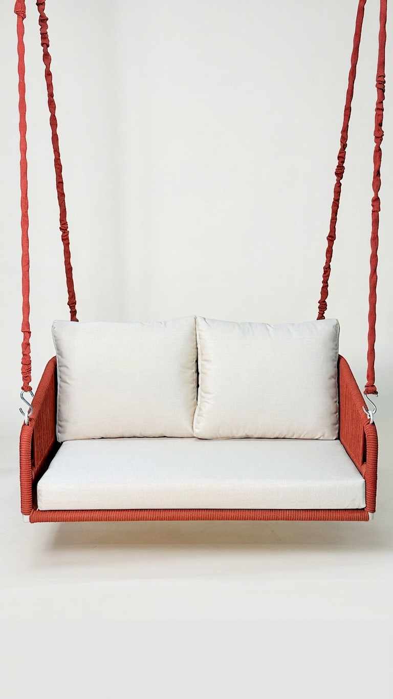 Finish: Rust Red Woven Rope with Off-White Cushions