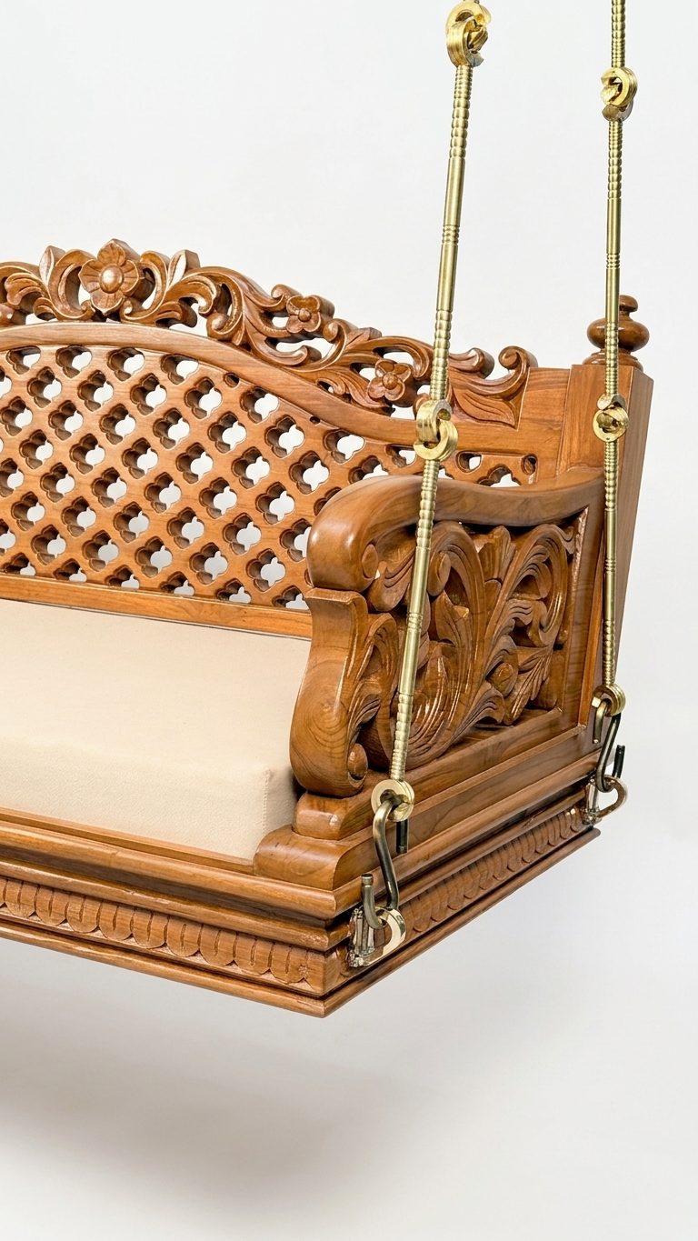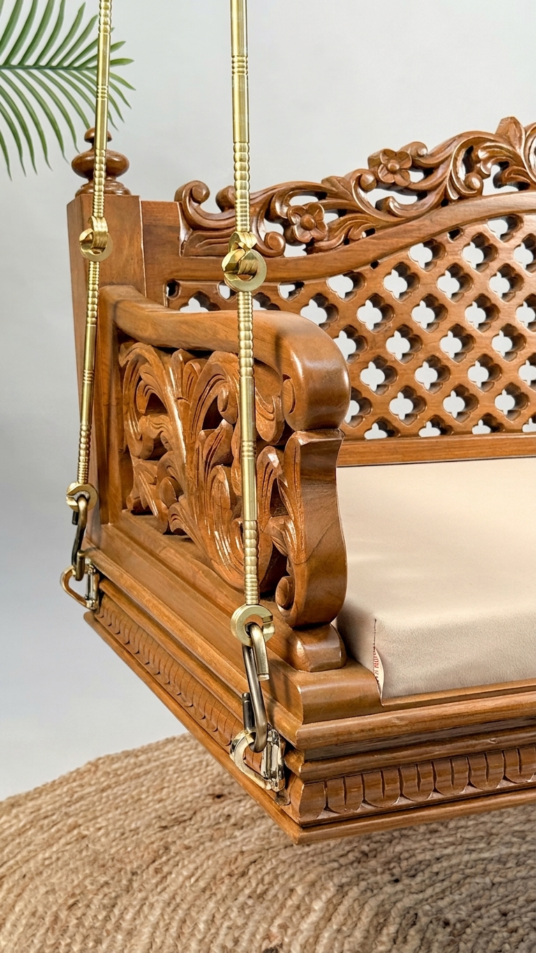 Design: Traditional handcrafted swing showcasing exquisite flower carvings and intricate ornamental detailing